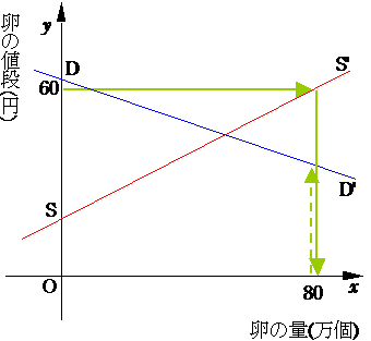 | 問題 (卵の値段と生産量はどうなる?) 上図は、卵の生産と消費の様子をグラフに描いたものである。青い直線は消費者の行動(安いほどたくさん買う)を表し、赤い直線は生産者の行動(高く売れるならば多く生産する)を表している。このとき、卵の値段と生産量はそれぞれどのような値で安定すると考えられるか。 (中1テキストより(一部改題))