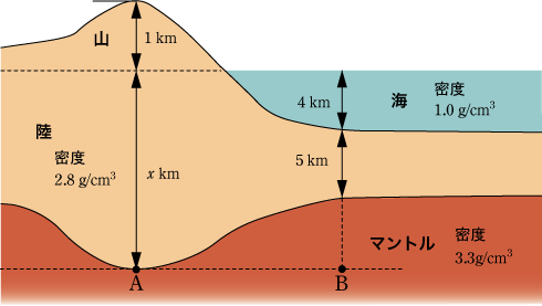 | 問題 (マントルの問題) 下図は、地球表面の断面図です。液体のように変形しやすいマントルという物質の上に大陸が浮かんでいる様子が描かれています。このとき、山の下の部分の深さx kmが分かりますか?(中1テキストより[一部改題]) ![]() |