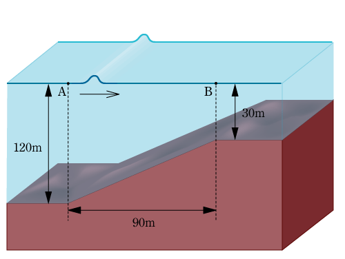 | 問題 (波の速さは?) 水深 h[m]の海の上を伝わる波の速さは、およそ√(10h)[m/秒]であることが知られています。これを用いて、図のような海底をもつ海で、点Aを通過した波が点Bに達するのにかかる時間を求めなさい。 (中2テキストより(一部改題)) ![]() |