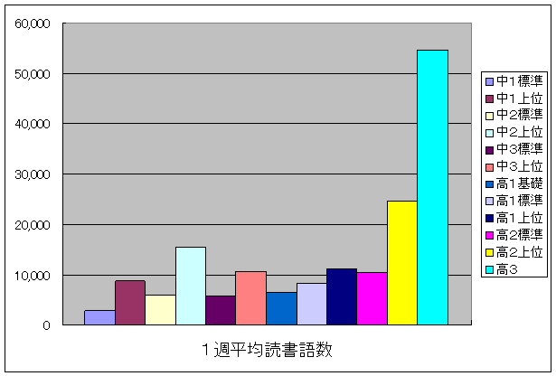 昨年から続けている人と、新規の人が半々のクラスです。読む力が安定している人が多いので、高1に比べて2倍の読書語数となっています。 |