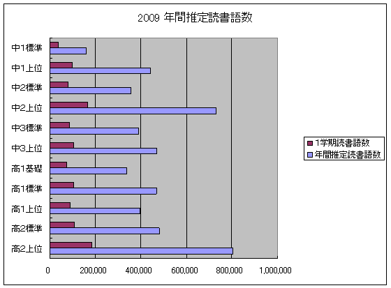 平均の週間読書語数を48倍すれば、1年間の年間推定読書語数がでます。実際には、長期休暇期間中も多くの多読生は読書をつづけるので、年間読書語数はこれよりもやや多くなると思われます。