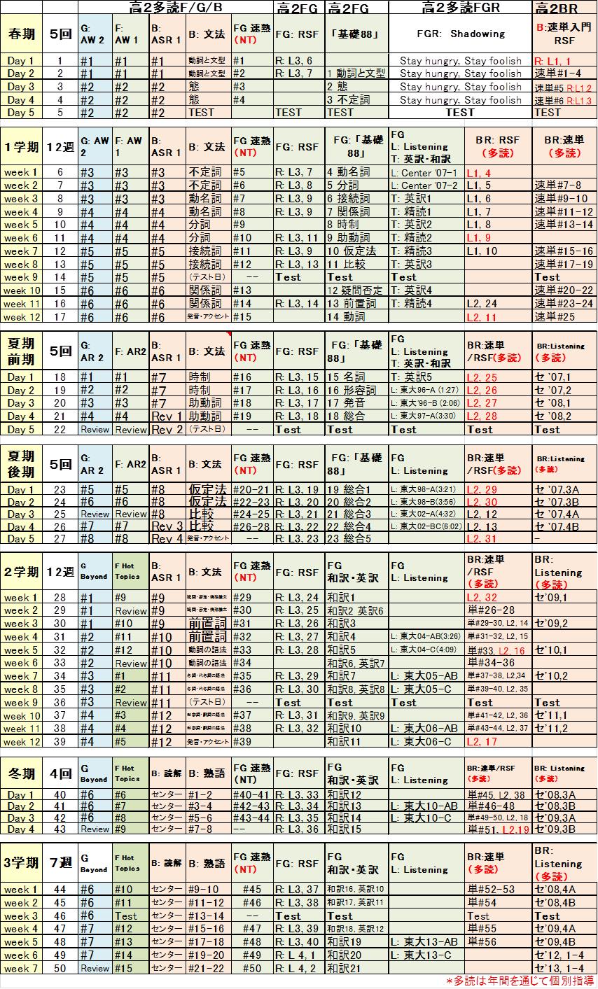 利用テキスト: リスニング FG:東大入試過去問/センター過去問/Reading for Speed and Fluency BR:センター過去問