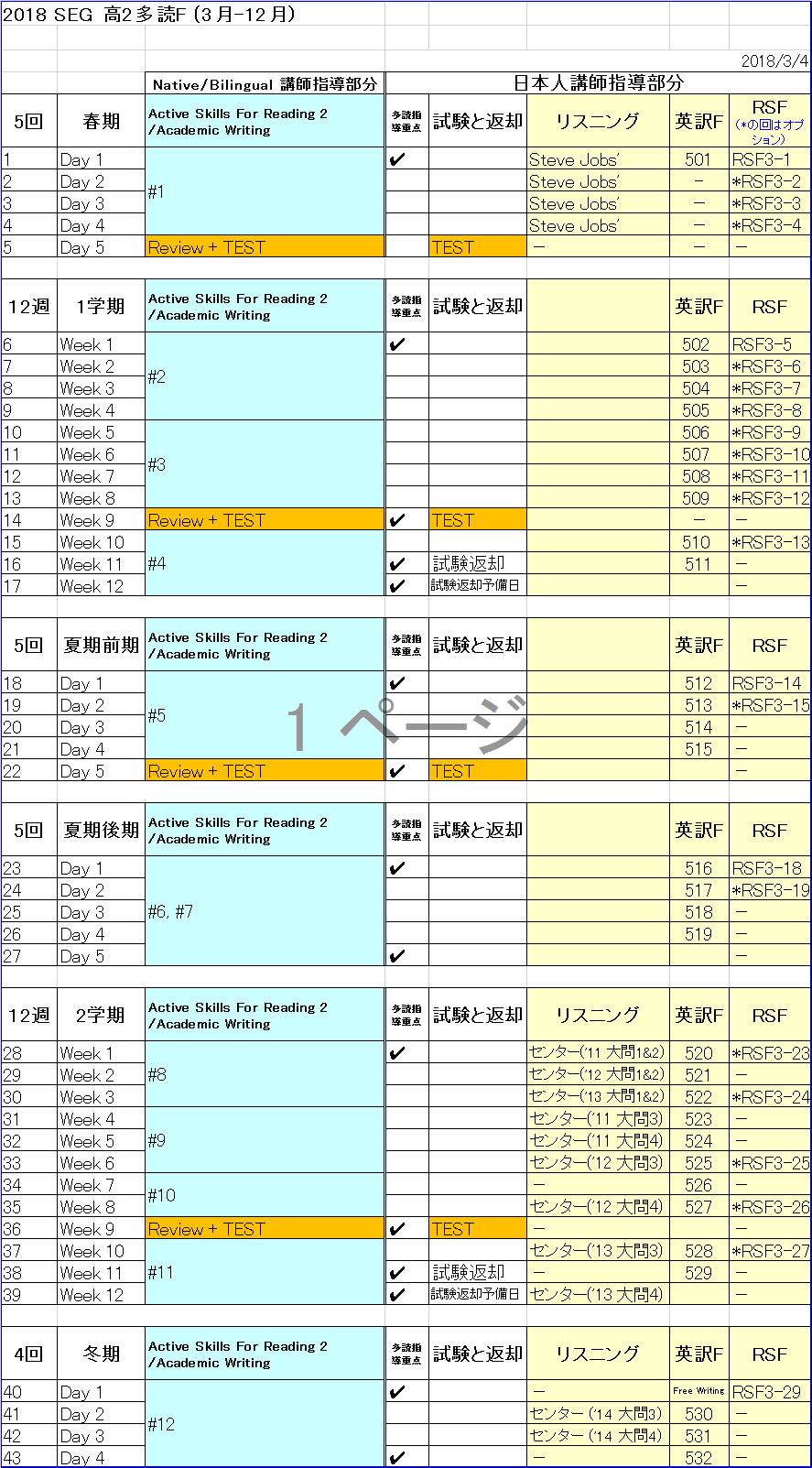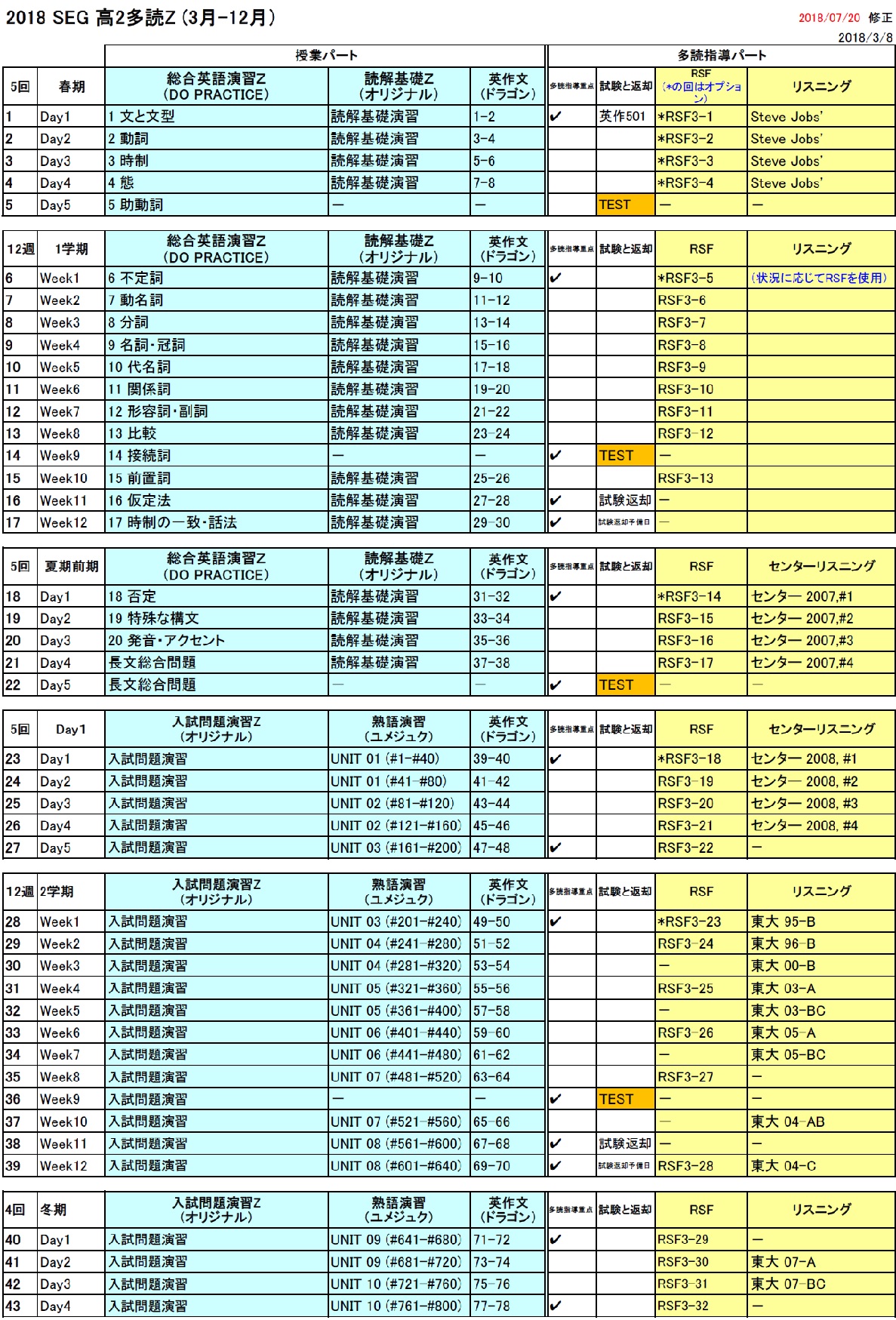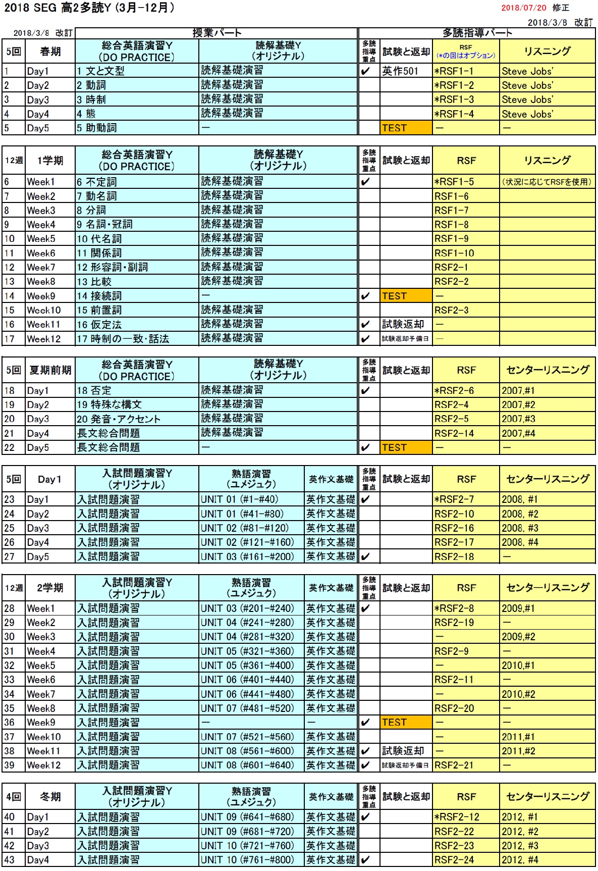 高2多読Y進度予定表