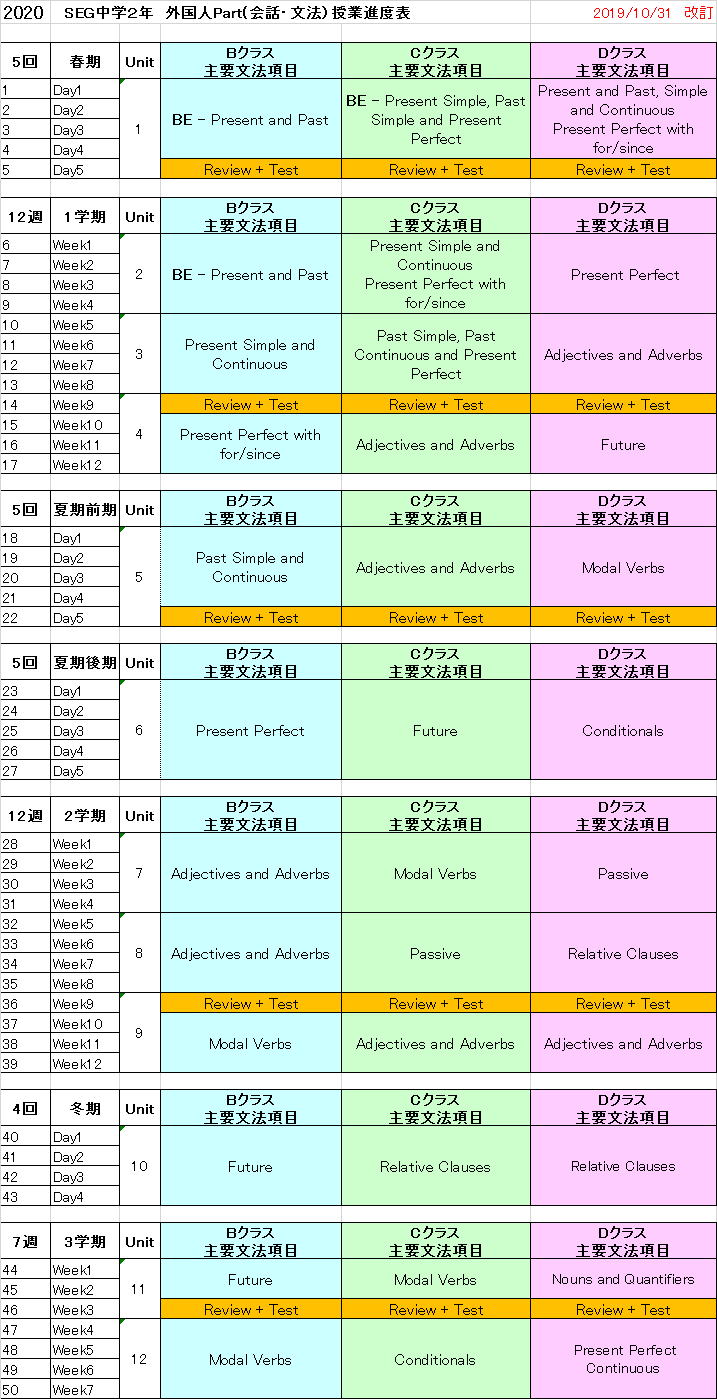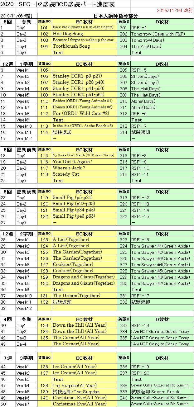 【中2クラス進度予定表】 日本人多読講師担当表はこちら