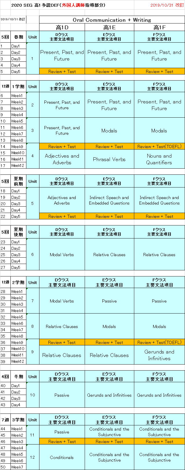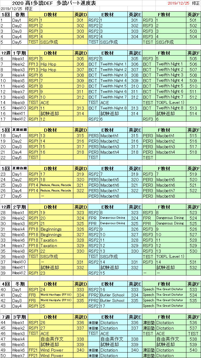 2020 高1英語多読コース DEFクラス進度予定表 2019/12/25