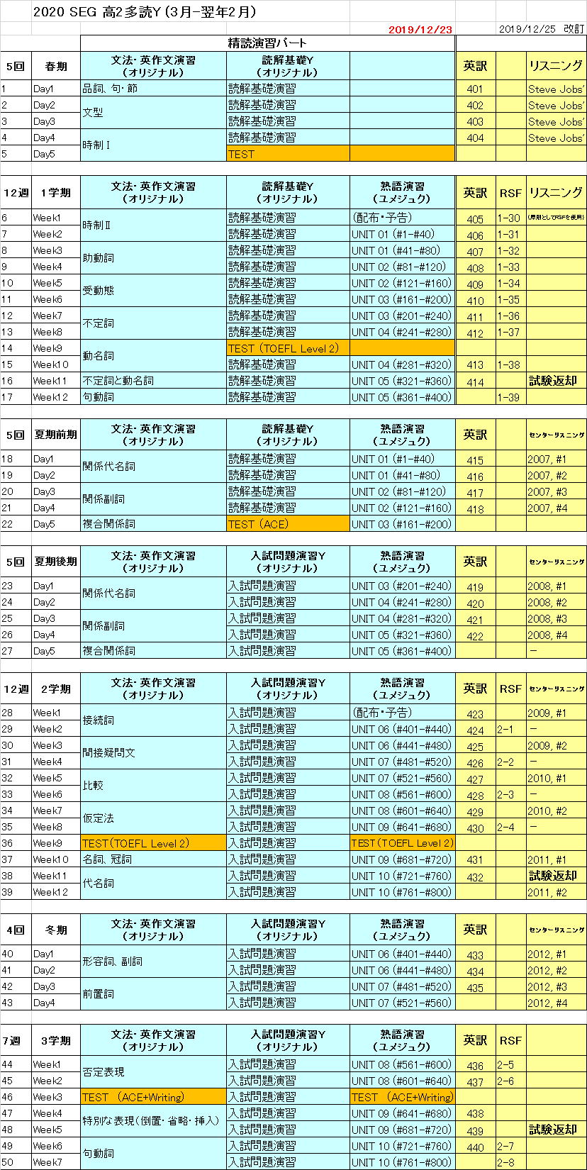 高2多読Y進度予定表