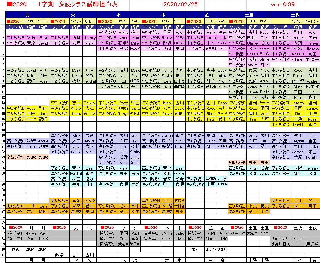 英語多読 開講曜日・担当講師一覧 2020/2/25