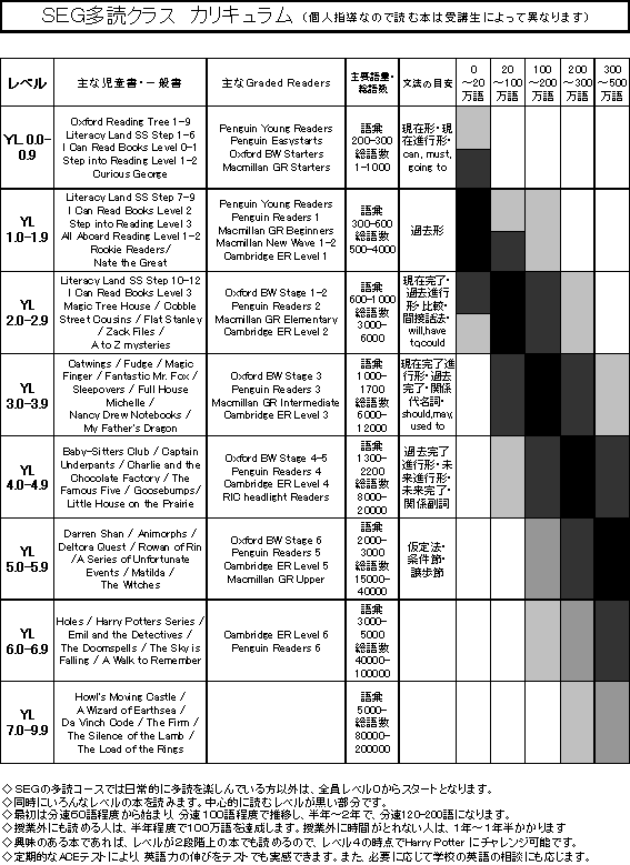 SEG 英語多読コースのご案内読書を楽しんで、英語力を伸ばすコースです!いま、社会人の間で、楽しい英語学習法として英語多読がひそかなブームとなっています。この多読を全面的にとり入れたSEG英語多読コースで、楽しんで英語を学んでみませんか? 楽しくなければ、英語学習は長く続けることができません。 このコースでは、中1〜高3の6年間のカリキュラムで、次の5つの力をつけます。 a) Harry Potter などの一般の原書を、普通に楽しめる速読力 b) 英語で書かれた、自分にとって必要な専門書を正確に読める読解力 c) 外国人と音声でコミュニケーションできる会話力 d) 英語でエッセイや数学の証明が書ける作文力 e) 国内大学進学・外国留学の双方の受験に対応する語彙力・聴解力・読解力・会話力・作文力 多読のプロによるシステマティックな多読・多聴指導 英語学習において「英語の本をたくさん読むこと」が非常に効果的であることは、夏目漱石、丸山真男、松本亨等、いままでも多くの先人達が強調しています。しかし、近年までは、「初学者にもわかる易しい英語の本」がほとんど無く、英語の入門期から多読を行うことは不可能でした。近年、日本多読学会やSSS英語多読研究会の活動により、「初期の学習者でもわかる易しい英語の本・CD付きの本」が大量に発掘され、それらを利用して、英語の入門期から多読・多聴を通じたシステマティックな英語学習が可能になりました。 大量インプットと直読直解が英語上達の鍵 通常の学校や塾の英語では、英語の訳読が必要以上に強調されています。しかし、、英語を読むのに日本語を介さなければならないという思い込みや、テキストをいつでも100%理解しなければならないという呪縛を捨てれば、英語のインプットもアウトプットももっと効率的にできるのです。SEGの中1英語多読クラスでは、3月から英語多読を始めた中1生の約3割が、中1終了の時点で1時間で2000語以上の英語を読めるようになっています。中2の夏期講習を終了した段階では、6割を越す受講生が、1時間で3000語以上の英文を読めるようになり、3割の受講生が、80分で1万語を越す英文を読めるようなっています。外部試験の結果でも、中2終了時に、高1相当の力がつき、中3終了時に高3相当の力がついています。(BACE結果、ACE結果) また、中1の基礎クラスからスタートした生徒で、中3の夏には、TOEICで、850点の成績を修めた受講生や、やはり、中1の基礎クラスからスタートした生徒で、高3の冬にはYale大学に合格した受講生もいます。中1の夏期の基礎クラスから始め、高1の秋には、TOEFL iBT86点の成績を修めた受講生や、 中2の基礎クラスから始め、高3の時には、国際地理オリンピックで世界1位になった受講生もいます。 非常に易しい本から始めて、辞書を引かずに訳さないで読む・聞くことに慣れれば、長い本を楽しめるようになり、飛躍的に英語ができるようになるのです。多くの卒業生が、楽々と英語の本を読めるようになり、大学入試も突破しています。(卒業生の生の声はこちら) 英語文章表現・発話指導の組み合わせで、発信面も充実 SEGの英語多読コースでは、多読のプロ講師による個別読書指導・シャドーイング指導に加えて、外国人講師による文法講義・プレゼンテーション指導・文章表現指導等を組み合わせ、中1〜高2の5年間で、英語のペーパーバックを自由に読み、英語で討論でき、自分の主張を英語で書ける力を養成します。高3になってからは、大学入学試験の準備や、留学のための準備に集中してもらいます。 (1)中1〜高2を対象とした、多読指導と文法・精読・会話・Writing指導のクラス (2)中3・高1を対象とした、多読多聴指導専門のクラス (3)高2・3を対象とした、多読指導と大学受験英語指導のクラス (4)高2・3を対象とした、多読指導とTOEFL iBT対策のクラス の4つのタイプのクラスを通年で開講しています。各クラスの特徴をご理解いだたき、適切なクラスで、英語力を伸ばしてください。多読指導の授業風景はこちらを、外国人講師の授業風景はこちらをご覧ください。 まずは、SEG英語多読コースの概要をご覧ください。 外部の英語教師等客観的な多読教室見学記も参考になるかと思います。 ■SEG 英語多読コースの新規情報